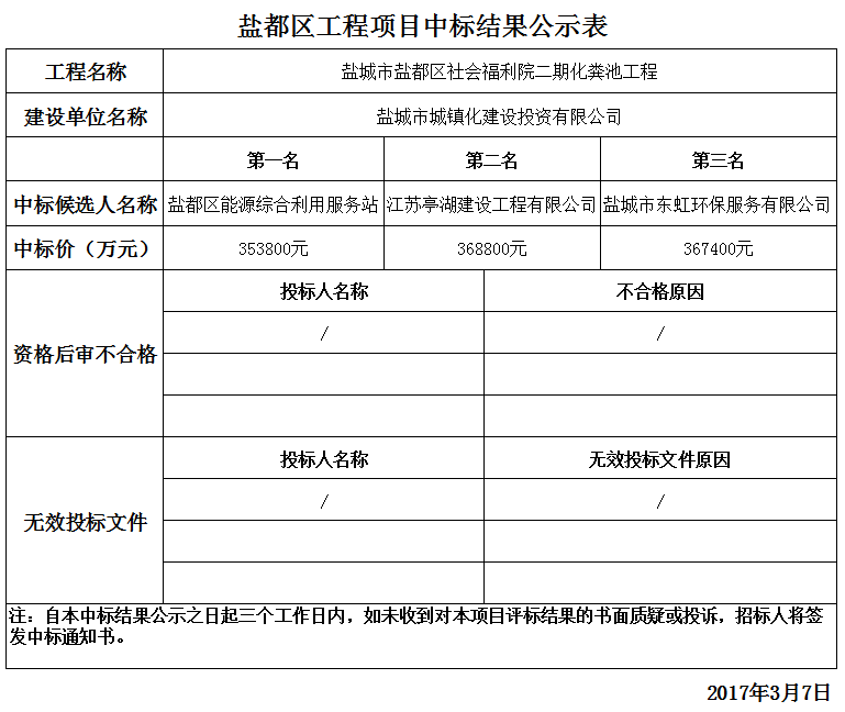 鹽城市鹽都區(qū)社會福利院二期化糞池工程中標結(jié)果公示表